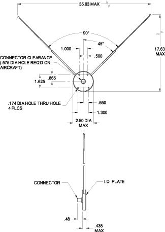 “V” Dipole VOR/LOC/GS antenna with detachable elements mounts on top of the vertical fin stabilizer offering the four-hole mounting configuration found on many beech aircraft. RF design similar to the CI 157P. Integral ferrite balun provides for higher radiation efficiency. Detachable elements result in a significantly smaller shipping and storage carton than fixed element versions.